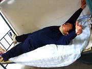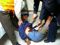 此种酷刑是将学员两腿双盘,两脚向后拉、由两恶警分别用脚蹬学员双盘的两膝盖,同时用粗绳子将双腿捆住,再分别拉绳的两头狠拽至极限,又一恶警死死的摁住后背,动弹不得,然后往学员臂部底下塞木棍,就这样长时间逼学员坐着。受此酷刑严重者腿被绑折,长时间不能行走。