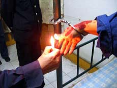 此种酷刑即是将人两臂抻至极限铐在单人床的两侧床柱上,身体呈”大”字形,由恶警四防员暴打,用脚踢小腹、前脑、软肋、脸、嘴,用椅子砸头,被打严重者牙脱落,耳膜穿孔,或用打火机烧手指,把手指烧焦烧黑,变形。大法学员贾精文在受此刑时曾手铐被抻折,大法学员李忠杰、左中右在受此酷刑时被四防郭伟宾、马九庆、沈闯、焦志华、安庆中暴打一个多小时,五脏被打得疼痛无法描诉,大法弟子李忠杰的嘴被踢得很长时间合不拢。