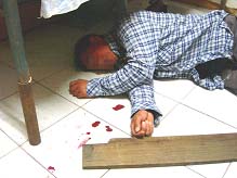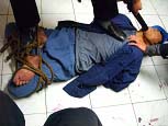 2)再带一学员进屋,两个四防抡起大木板子就打,把人打跪在床边,四防仍然狠命的打,学员的后背、头部均被打伤,最后昏死过去。(如图29、30、31)