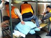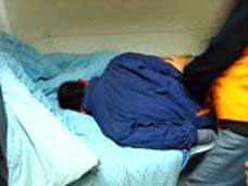 此种酷刑是四防员用木板子打学员,然后由四名四防用棉被强行将学员头包在里面,脚露在外边,棉被缠住学员的头,致使学员喘不过气来。由两个四防坐在棉被上,在学员的头部、胸部位置用力压,另一四防用电棍电击脚心。半小时后,受刑者就昏昏沉沉的什么也不知道了,也不知打了多长时间,再次醒来时被子已被拿开,四防员见受刑者醒来,又用拳头向他脸上猛打,直打得血从嘴角流下,脸部肿大,牙活动为止。