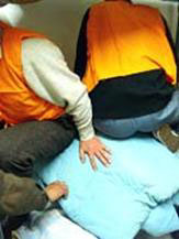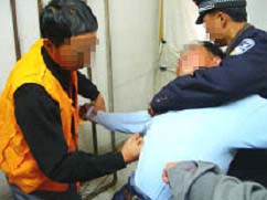 此种酷刑是一恶警冷不防从学员身后用一只胳臂从脖子搂住往后摁全身半仰式,再由两个四防员用拳头向两肋猛捶打。
