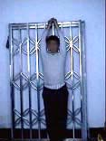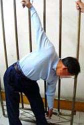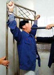 吊刑3) 此种酷刑(又叫一字铐)是将学员双臂平衡抻至极限,横铐在铁门上,长时间施以此刑会使受刑者肩胛脱臼,手臂僵直,不能正常活动。