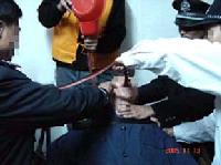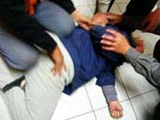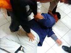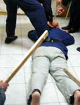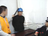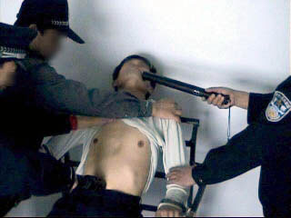 吊刑1) 此种酷刑是先将学员双手铐在铁门上,恶警当着张海平、金福利的面,由四防协助暴打学员,为讨好上司,更加凶狠的用刑还不够劲,残忍地将电棍捅进学员的嘴里,电击学员,此刑极度痛苦,受刑后很难恢复正常。