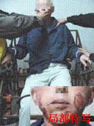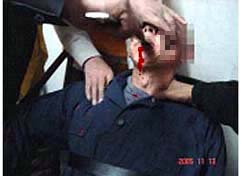 2)恶狱医由于学员不配合迫害,在灌食前用手指狠狠的摁、捏脸睑部(颧骨下缝处)恶警用螺丝刀把儿猛击和拧两腮,使学员因巨痛而张嘴,如图50。