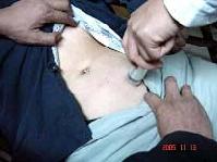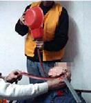 4)开始灌食如图53、54、55.恶警把约中指粗的用来洗胃的管子插进胃里后不是正常灌食,而是把插进胃里的管拉出来再插进去,如图局部特写,用此手段折磨学员,当把学员折磨得死去活来,全身痉挛后才灌食,灌进去的是气味难闻,有药味的东西。