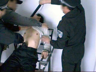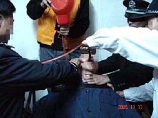 此种酷刑是将学员的双手、双脚固定在铁椅子上,恶警主要电击大法弟子的颈部、下颚、面部和腹部等部位,反复电击。如不“转化”、写三书,这样的酷刑不间断。被电击的学员满身是焦糊的伤口,伤口和衣服粘在一起。受刑者极其痛苦又不能动。