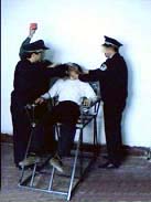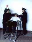 1)将学员双手臂固定在铁椅子的两扶手上,用铁环扣紧,将两腿固定,用皮带勒住,再将两脚脖子用铁环扣紧固定,上身用皮带固定在铁椅子的靠背上。这样整个人就被死死的固定在铁椅子上,不能动,如图49