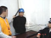 此种酷刑是恶警把学员带到酷刑室,强行戴上安全帽,双手倒铐在身后,用一张大办公桌把人挤到墙角,不许坐、不许睡觉,不许靠墙,稍一闭眼就用铺板子、棍棒猛敲击头部,强制看诬蔑大法的录像,音量放到极限。这样学员仍不妥协,恶警就会用电棍电击学员的头部、脸部、脖子、前脑、后背、小便等处。其中,李松涛、冯子斌、张春风、王建国最为邪恶凶狠。冯子斌恶狠狠的说:“不转化,就让你们烂在这里。”