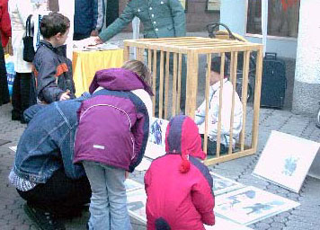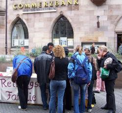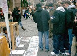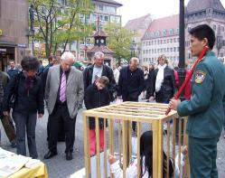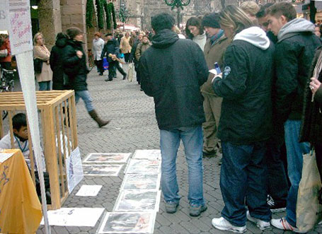 本月初胡锦涛访问德国期间,中国的人权问题被德国媒体和政界强烈关注。德国巴伐利亚州的法轮功学员在胡访德前后陆续办了多次呼吁制止迫害的征签活动,得到大量民众的支持。当步行街上来往的路人看到学员模拟演示的酷刑和揭露酷刑的画作,不由陷入了沉思,为什么在表面繁荣的中国,背地里却发生着如此非人道的迫害?不少人立即行动起来,签名要求制止迫害,展台前面常常是同时站满了一排签名的人和迫切想了解法轮功真象、及中国实际情况的人。有人建议法轮功学员把反酷刑展办到和中国做生意的大商业集团门口;有人指责德国大公司竟然和有这样的人权迫害的国家做生意;报社、杂志的记者们则把镜头聚焦到“坐小笼”的酷刑模拟演示上。通过讲真象、征签,很多对法轮功存在不解和迷惑的人,看清了这场发生在中国的迫害的本质。