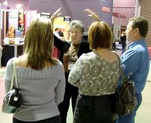 两天的博览会很快就要结束了,其它展位的人主动的相继过来了解真象、拿资料。隔壁展位的摊主不时的过来拿资料送给她的顾客。人们珍惜着分分秒秒的时间。有的人正在和法轮功学员说话,看到电视播放法轮功创始人的教功录像时,马上奔到电视机前学起动作来。
