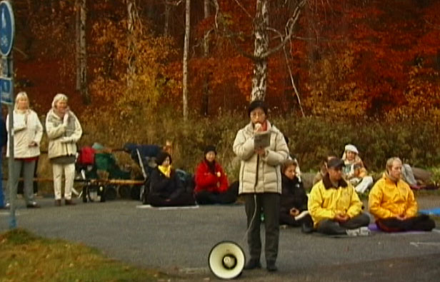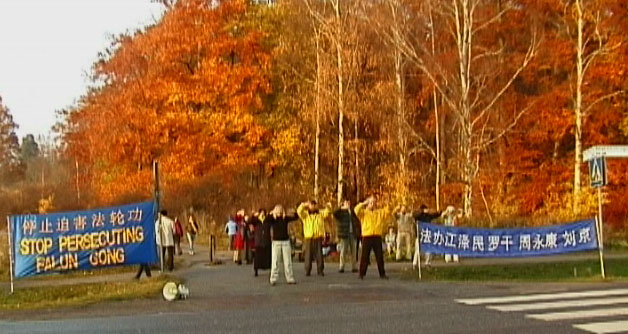在宣读《公告》前后,学员们展示了5套功法,来往行人不时停留观看,索要法轮功真象资料,听学员讲述真象。