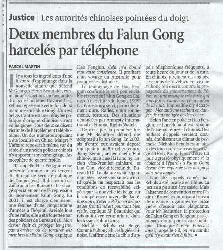 郝斯收到的一通电话号码显示是来自中国的。据此已可以立案。但由于北京与布鲁塞尔之间尚未建立公约以允许向中国调查,原告的希望将会很小。波梯埃律师表示,对法轮功学员的保护有可能会通过政治方式解决。乌托邦的幻想吗? 他提醒道:“在皮诺切特(Pinochet)案中,当初我也曾被告知我们什么也做不了。”