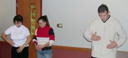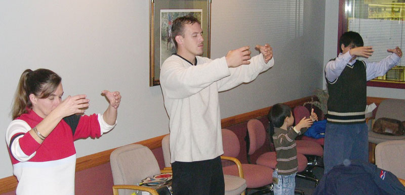 几个法轮功学员分工合作,有的准备音响设备,有的放置介绍法轮大法的展板,有的在外面发放介绍法轮大法的传单。学习班下午2点开始,首先放映了介绍法轮大法的8分钟的录像,然后一边看法轮功创始人李洪志老师的教功录像,一边学习动作。来参加的当地居民虽然不多,但他们都对法轮大法和“真善忍”的原理表现了极大的兴趣,他们学得很认真。