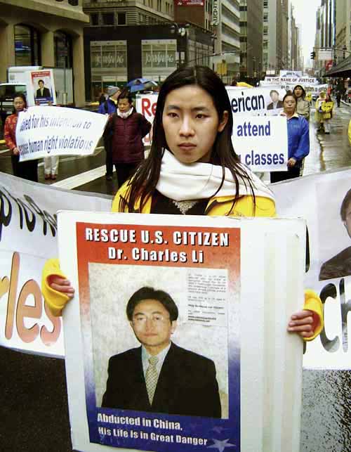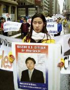 ![]() 北一女中的学生(着墨绿黑裙者)仔细看着 | ![]() 【摄影作品】美国公民李祥春医生遭中共非法关押,图为他的未婚妻在反迫害游行中呼吁援救李医生的画面。 |