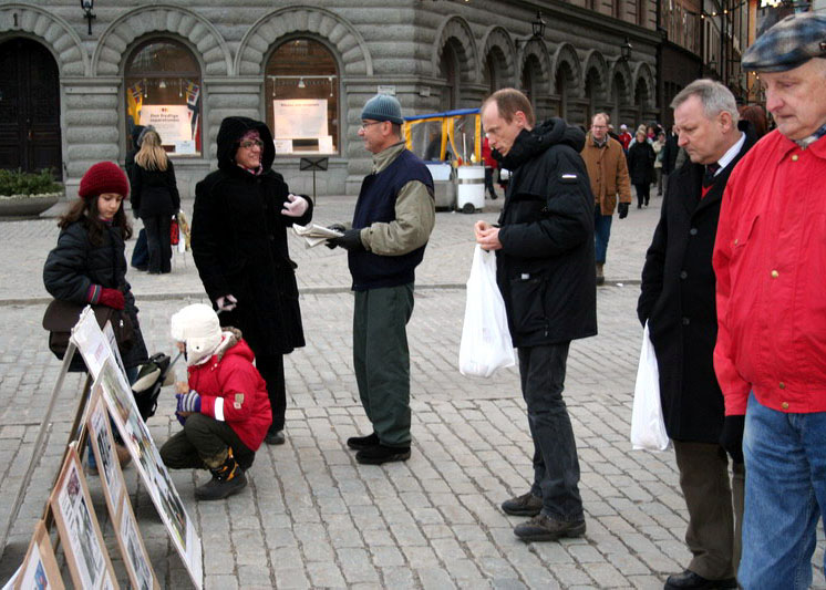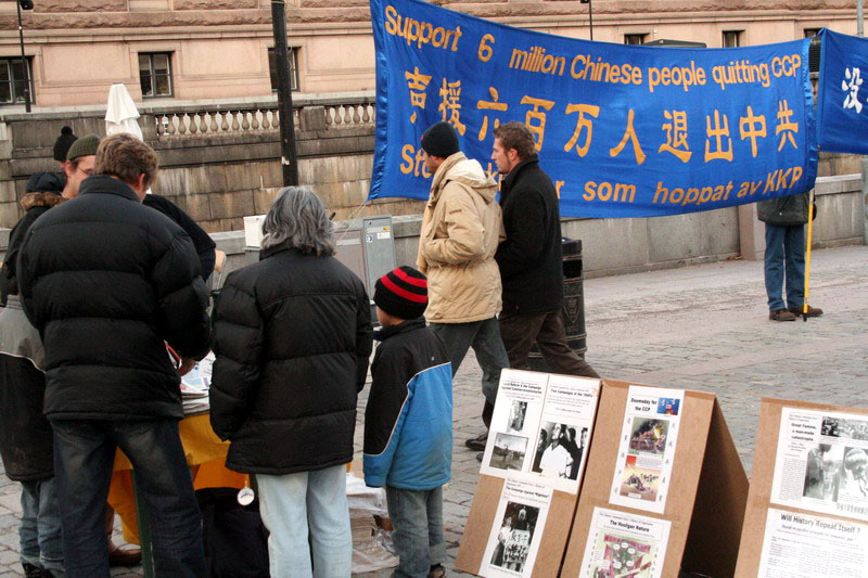 一位瑞典的中年女士,拿到瑞典文的《九评共产党》非常的高兴。她说:“中共的独裁,残暴,我们都是有目共睹的。但中共对法轮功的已经持续6年多、如此残酷的迫害。我了解的不是很多。但中共的本质我是最清楚的,所以我相信这一切都是真的。”当她听说不久前发生的河北警察何雪健当着同事的面强奸跟其母亲一般年龄的法轮功女弟子时,不住的摇着头。