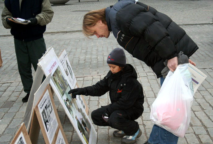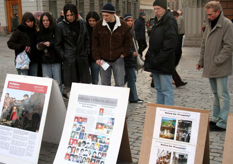 钱币广场离市政厅很近,与皇宫和国会只有一步之遥,这里还是人们观光购物的必经之地。中午12点,在钱币广场上,展开着写有“声援600万人退出中共”、“没有共产党才有新中国”、“维护人权,解体中共”的大横幅,摆放着揭露中共暴行的图片展。这些横幅与图片引起了瑞典市民与游人的震惊与关注,人们停下脚步认真观看并不停询问。尤其是中共现在仍在对法轮功修炼群体的令人发指的残酷迫害,令人们深感惊讶和不解。