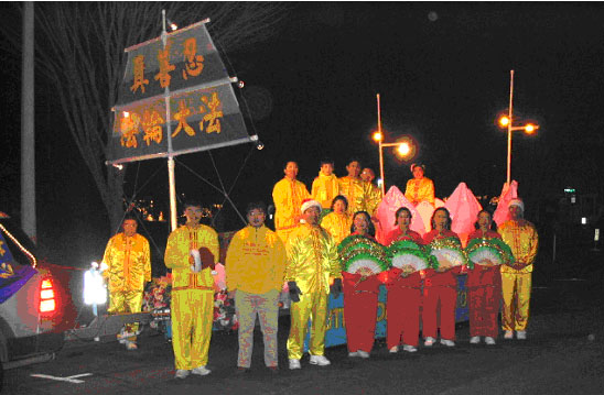 夜幕降临,俄勒冈、华盛顿州法轮功学员们精心制作、装饰的花车在“法轮大法好”的歌声中出发了。身着鲜艳民族服装的女学员翩翩跳起欢快的扇子舞,花车上大小莲花之间学员们不断展示着五套功法,祥和而优美。人们欢呼、拍照,急切的记下这美好的时刻。花车一路走去,“法轮大法好”的嘹亮歌声久久回荡在夜空之中。