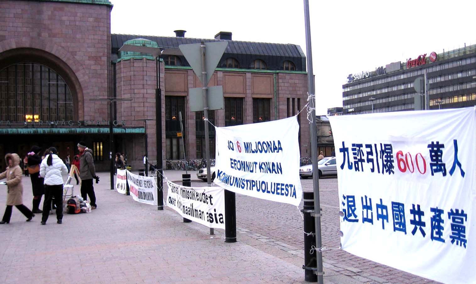 当天是赫尔辛基入冬以来最冷的一天,也是圣诞前夕人们忙于购物的日子,匆忙的人流络绎不绝。但在悬挂着“九评引爆600万人退出中国共产党”的中、芬文横幅前,在中共历史上对中国人民所犯罪行的展板前,在法轮功学员高蓉蓉被电击毁容的照片前,人们放慢了脚步,表情中透露出同情和希望了解这一切的疑问。许多人立即接过资料或找义工询问。