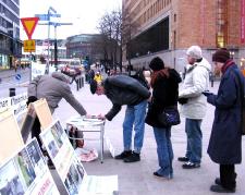 当天签名声援退党的人非常踊跃,签名簿刚摆到桌上,就有几位芬兰人迫不及待的前来签名。整个活动中多次出现排队等签名的现象。近来芬兰电视台陆续播出了中共屠杀汕尾村民、法轮功学员高蓉蓉被毁容并遭中共迫害致死、及对出走加拿大的前中共沈阳司法局局长韩广生揭露中共邪党内幕的报道,使芬兰人民对法轮功遭中共迫害的真象有了更深入了解,并引起对中国人权现状的高度关注。