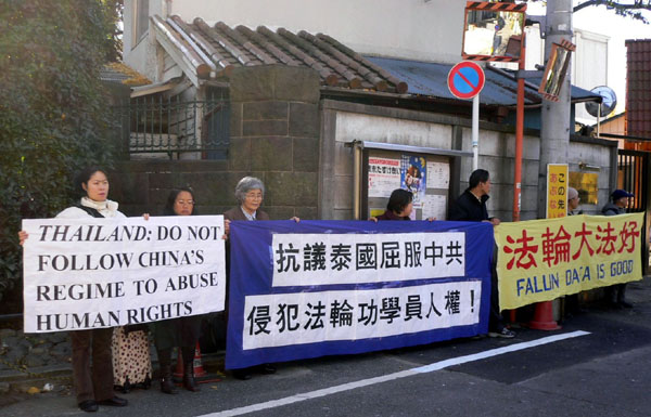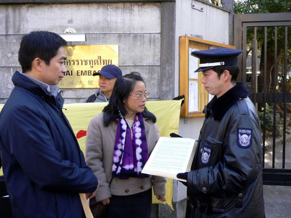 ![]() 日本学员泰使馆前抗议泰警屈服于中共侵犯法轮功人权 | ![]() 向泰使馆递交抗议书 |