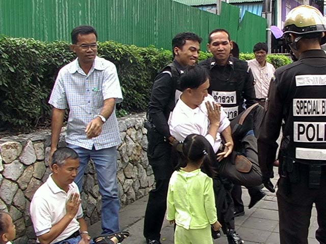 ![]() 开心看着爸爸被泰国警察抬走,惊恐万分。 | ![]() 开心给泰国警察莲花 |