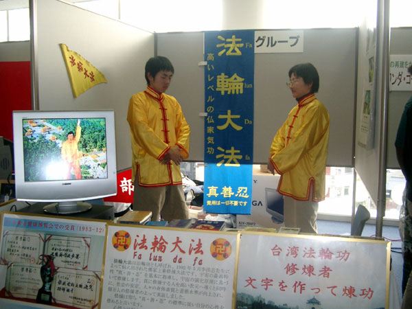 到展位来的也有很多人。一位来自中国吉林省的中餐馆厨师,拿了学员给他的真相资料后说,一直说“谢谢!”一位来自澳大利亚的白人青年,当场买下了英文的教功VCD,表示要学炼法轮功;一位旁边展位的卢旺达黑人女士,在看了法轮功的英文简介后,询问如何学法轮功。学员告诉她正好还有一盘英文的教功录像带,她非常想买,但又担心日本和她国内的录像带不一样,拿回国是否能看,因为她明年2月份就要回国。当学员告诉她法轮功的所有书籍、录像都可以在网上看到、免费下载的时候,她非常高兴。