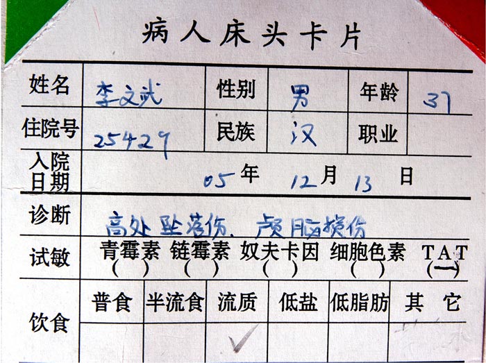 大法弟子李强当晚被送到吉林市第二医院(肿瘤医院)脑颅科,图为李强在肿瘤医院住院的床头卡。据肿瘤医院的医务人员说:“人没事,头部上后面有一处有积水,腿、脚部位有擦伤,脚有损伤。”医务人员还说,“他神智清醒,没事儿,只是不和我们说话,现在不吃东西、不喝水。”医务人员听他说过一句疼。