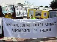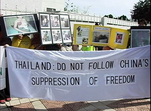 ![]() 在泰国大使馆外抗议 | ![]() 泰国大使馆派出代表接收信函 | ![]() 法轮功学员接受媒体采访 |
