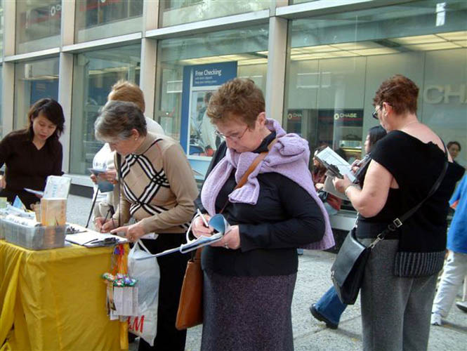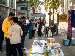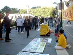 一直以来曼哈顿每天至少有三个洪法点,其中两个有办反酷刑展,这里的法轮功学员除了美国当地的,还有来自加拿大、澳洲、台湾以及欧洲的。他们中有青年人、中年人也有七十多岁的老年人。他们表示,来曼哈顿是要向世界人民揭露中共对法轮功的迫害;并说会直到迫害停止。他们怀着一个共同的心愿,日复一日,年复一年,风雨雪无阻的在那里坚持发材料,讲真相。