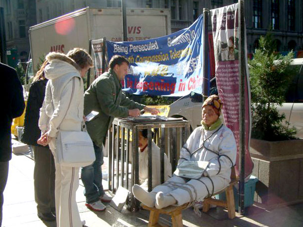 经过反酷刑展的人们,无论是什么肤色,也无论他们来自世界的哪个角落,当他们走到法轮功学员的展位前,看到那被关在笼子里和被捆在老虎凳上的看上去奄奄一息的法轮功学员,看到那被血腥迫害后惨不忍睹的照片时,他们自然会问这是在哪里发生的事情?这不是人间地狱吗?当学员迎上前去向他们讲清了这是中共对坚持真善忍信仰的法轮功学员的血腥屠杀和非法的迫害时,有的会惊呼:“这实在是太残忍了;我不能用语言来表达心情,我的心在震颤。”