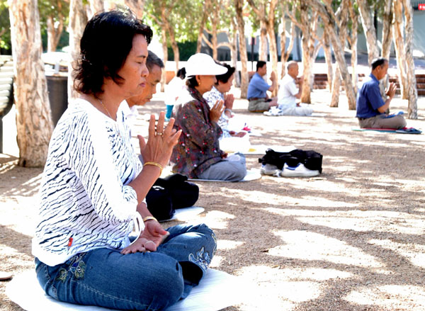 公园里的游人虽然比往常少了许多,但一点没影响法轮功学员炼功的气氛,祥和的炼功音乐传遍了公园,飘向远方。