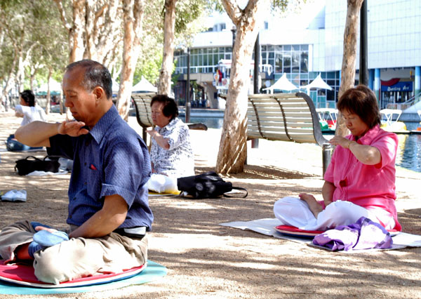 自师尊在96年来澳洲悉尼传法,并指定达令港公园的炼功点后,9年来无论刮风下雨,悉尼的法轮功学员都坚持在这里炼功。数不清的世人在这里见到法轮功、了解法轮功,还有许多有缘人来到这里学功并走上了修炼之路。