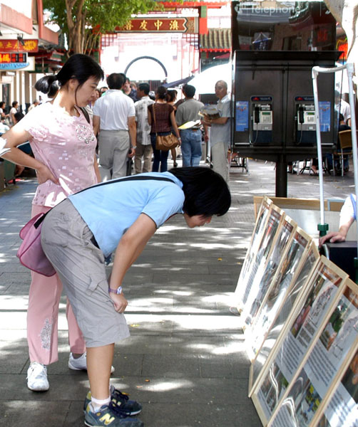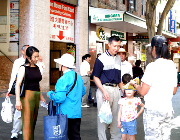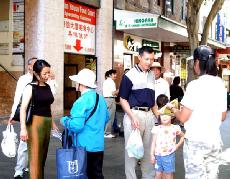 自99年7.20中共发动了对法轮功的残酷迫害之后,为了让广大民众了解法轮功真相,每个周末,悉尼法轮功学员都在中国城设立真相资料点。今天虽是圣诞节,但悉尼中国城的行人不断,当学员把展板安置好后,马上过路的行人就走过来看,并索取资料。学员们热情的向行人讲真相,递资料。