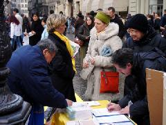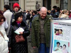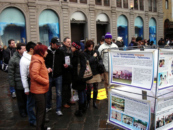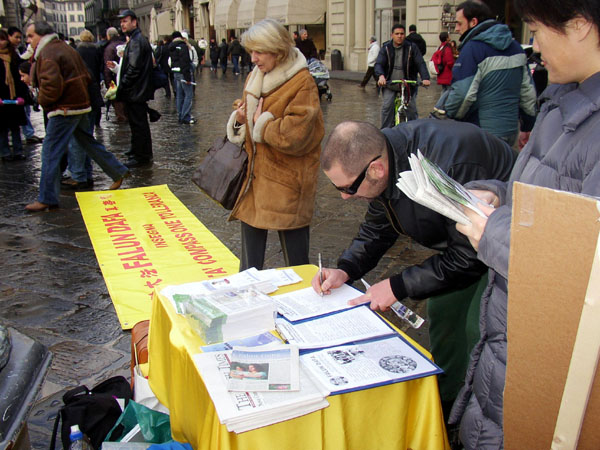 来自于不同国家和地区的人们都接受了真相资料。明白了真相的人们纷纷前来签名表示对法轮大法和受迫害的大法弟子的声援。人们对于这样一个祥和宁静的功法却要受到中共暴政的迫害表示了他们的愤怒。一位意大利人表示,这些酷刑的照片让她非常难过,她没有想到在今天还有这样惨绝人寰的事情在发生着。一位圣方济格教会的修士在看了真相资料后,在征签簿上写下了他的名字。很多人在征签簿上签完名后,对法轮功学员给他们带来真相表示感谢和赞赏,并鼓励学员们要坚持下去。