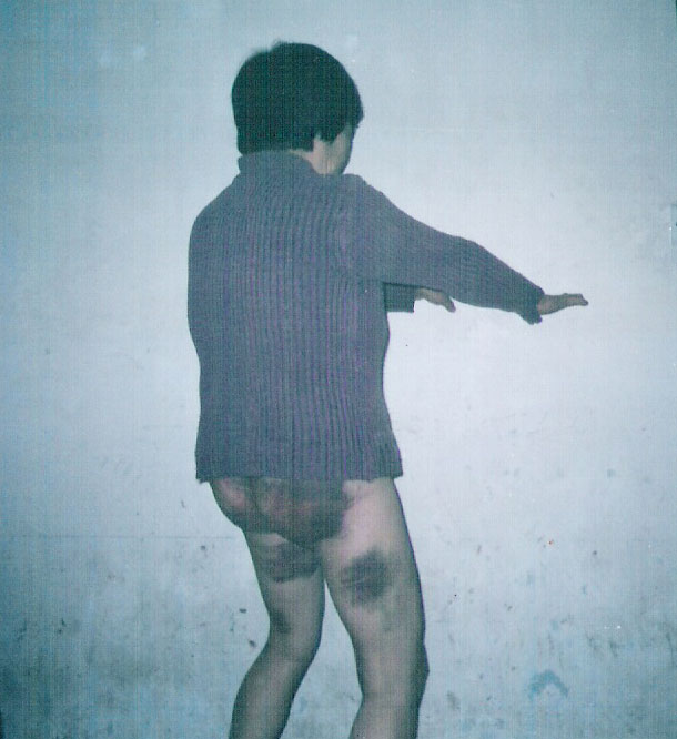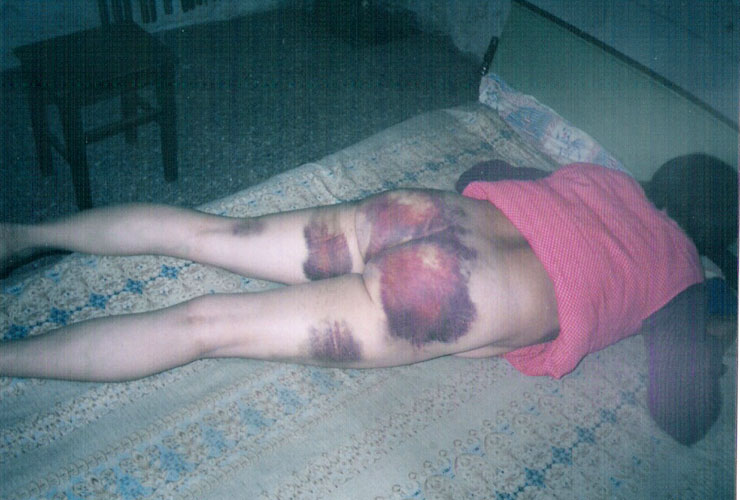 屋里另一个警察说“拿我的一起电她”,那个人出去转了一圈结果没有找着电棍。结果他们又用胶皮警棍狠打我。我承受不住向前仆倒,他们又把我揪起来,接着打我,把我打的都是伤。