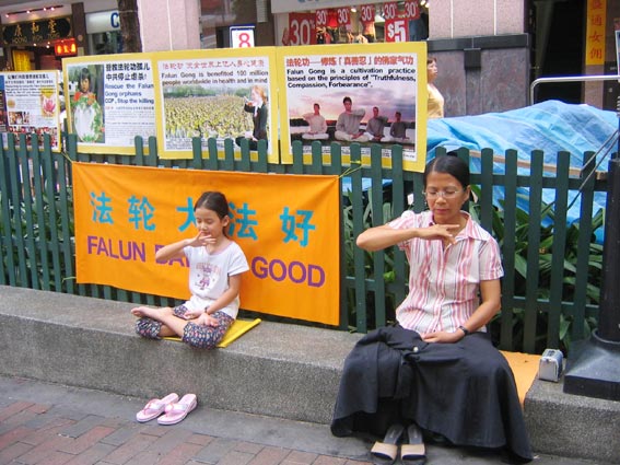 ![]() 过路的民众被真象吸引 | ![]() 学员在演示法轮功功法 |