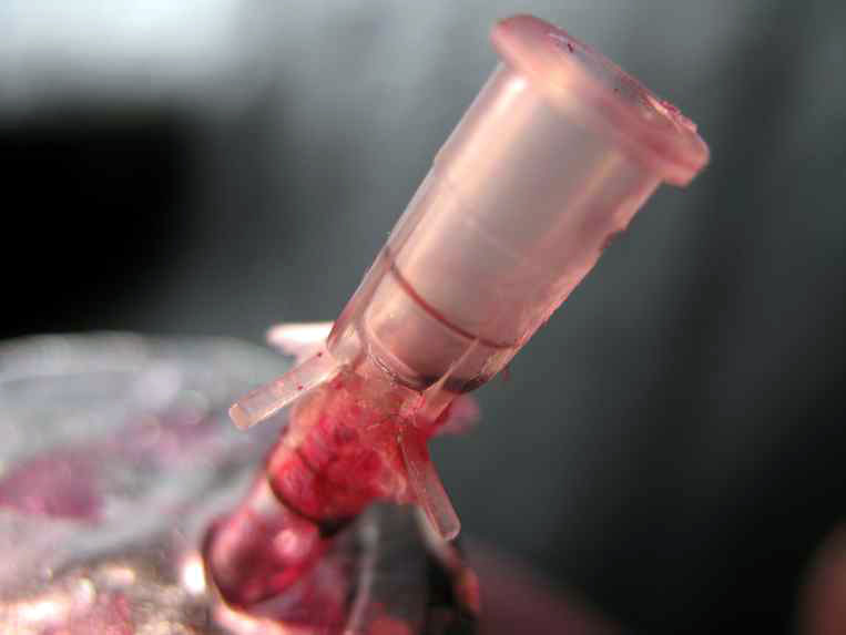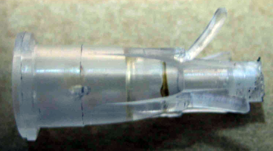 先把注射器用的针头前部的铁针部份用钳子拔出把上面的残余胶刮一下,观察针头末端塑料接嘴,如图所示,先把塑料接嘴的四个棱分别用壁纸刀割开,要注意别割断,可以作为支架防止进入墨瓶,如果不慎割断了也没关系!