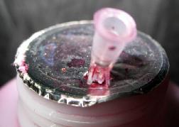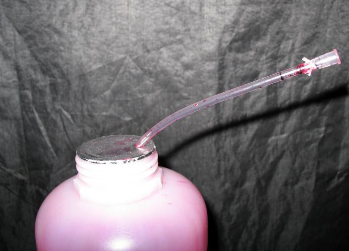 接下来把准备好的输液管或吸管按照墨水瓶的高度剪下。如果是吸管要保证能够套入已割好的前端,然后用AB胶在塑料接头前部管口处涂胶,再把剪好的管子一头插入即可。待胶干后插入墨水瓶,墨瓶金属封口开口不要太大刚好容下胶管即可。如图所示。用时,只要把注射器插入塑料接口即可抽墨,抽出墨后从接头处拔下即可注墨。不用再把墨瓶倾斜抽墨了,原理也是效仿现在常见的喷壶原理,但要注意软管尽量选择较硬的,以防在瓶内打弯时,当墨水接近瓶底时不容易吸墨!还有不用时,用塑料袋把瓶口罩上防止灰尘,仅供大家参考!如果有更好的方法也希望大家交流!