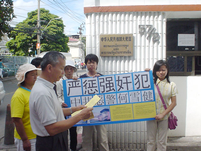 泰国法轮功学员在此表示强烈抗议,并呼吁国际社会帮助制止仍在中国发生的残酷迫害,严惩强奸犯何雪健及各级责任人,法办迫害法轮功的主犯江泽民、罗干、刘京、周永康。