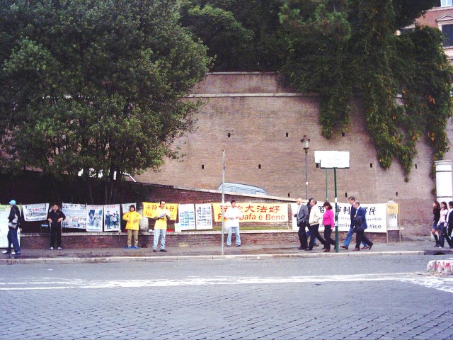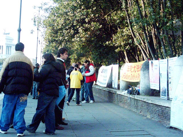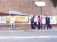 2005年1月16日那天,在罗马的法轮功学员又来到古罗马竞技场讲真象。由于受到了一些干扰,真象展的条幅和展览照片不允许象以往一样挂在石柱上。学员们便用几根木棍将展览照片和条幅悬挂起来。每个人一手扶住木棍,另一只手向行人递发传单。很多远处的行人看到学员们无法将传单递到他们手上,便主动走过来拿并对学员表示感谢。他们真诚的道谢中充满了敬意。学员们发现虽然当天的行动受到了一定的局限,但散发出去的传单一点也不比往常少,这一天也是学员们听到真诚感谢最多的一天。