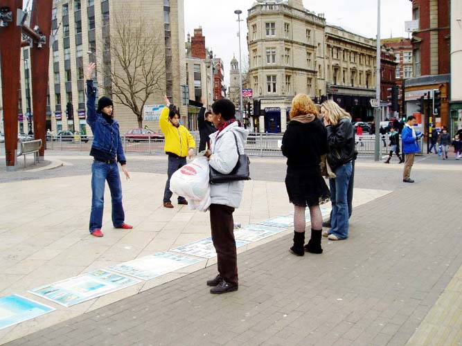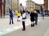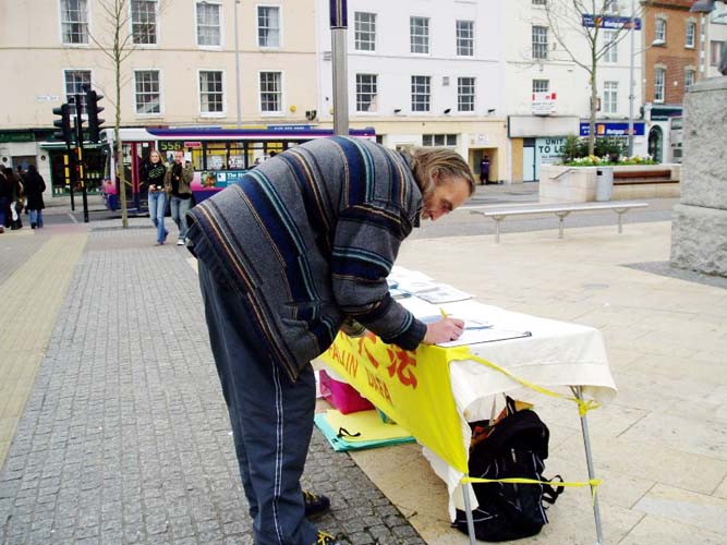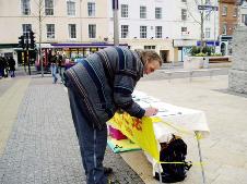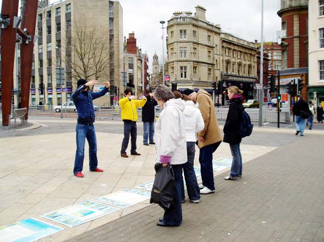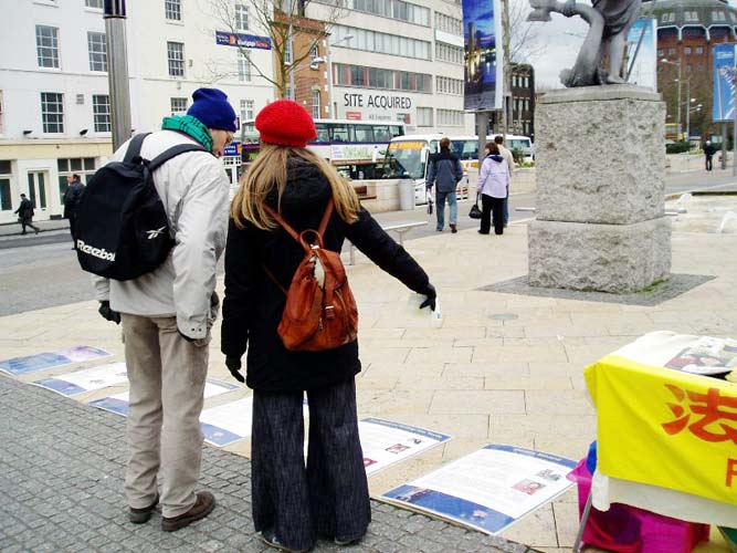在此之前,学员们已在布里斯托市举行过多次洪法活动,许多民众对法轮大法已不再陌生。有的人来到征签台,还没等学员开口,就直接跟他们的朋友介绍起大法来;当有位先生看到摆在桌上起诉江××的征签表时,向他的朋友们说:“看!就是这个大坏蛋干的。”许多路人匆匆走过,没来得及停下来了解展示内容,学员们主动上前递上真象传单,有些人看了一眼,就说:“喔,法轮功,我知道。”有一家人经过展位,年幼天真的孩子们看到功法展示时问道:“这是太极吗?”孩子们的母亲认真的告诉他们:“不!孩子们,这是法轮大法。”