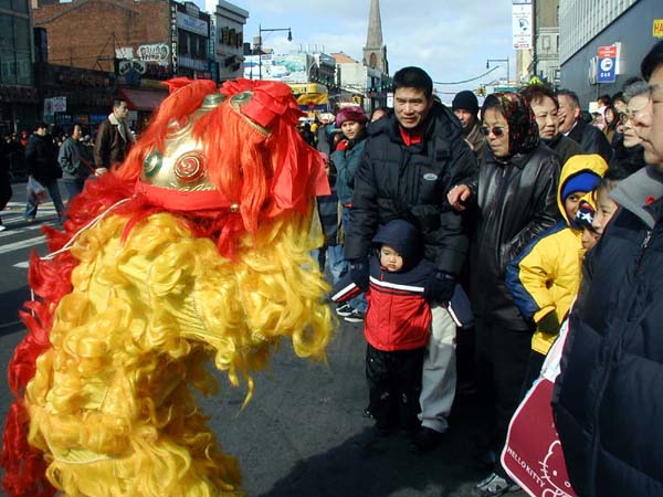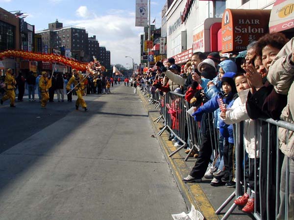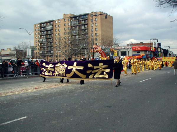 1999年7月中共江氏集团在大陆开始迫害法轮功,并以在纽约的领馆为大本营,把魔爪伸向了各个华人社区,以亲共社团为喉舌,百般阻挠法轮功学员参加社区的各项活动,特别中国城、法拉盛的新年游行。法轮功学员持之以恒,坚持向社区的各界人士全面讲清真象,进行法律咨询,及时和媒体沟通,揭露中共在美国的国土里践踏信仰自由。法轮功学员最终都参加了2000、2001、2002、2003年的法拉盛新年游行。2004年起法拉盛社区全面接受法轮功学员的游行队伍,并且法轮功学员的游行队伍赢得了内容丰富,多姿多彩,很有看头的好名声。