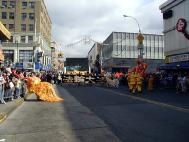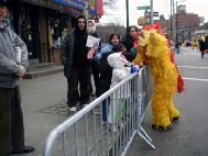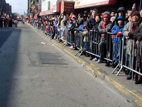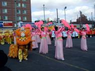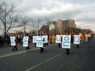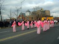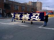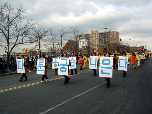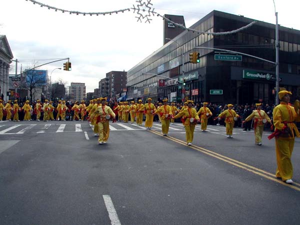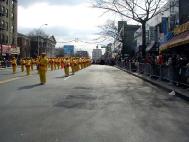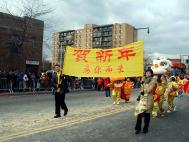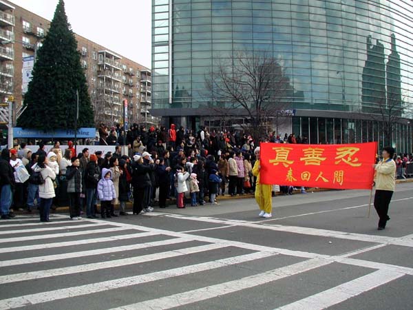 游行队伍以紫色丝绒上金字“法轮大法”开路,一条金龙随其后,金底红字“贺新年--为你而来”横幅给父老乡亲拜年,四头狮子大摇大摆,大头娃娃手摇蒲扇,平添节日气氛。其后是横幅蓝色丝绒上镶嵌金字“真善忍”。接下来是气宇轩昂的腰鼓队,以红底金字“真善忍—为你而来”横幅打头。因为法拉盛还是一个韩国人聚集的社区,来自韩国的法轮功学员特别带来了韩文“法轮大法好”。学员们还组成了一个群众队伍,手举中英文“法轮大法”、“真善忍”,男女老幼都有,向父老乡亲拜年,告诉大家法轮功学员不仅是信仰真善忍的修炼人,也是社区普通的一员。扇子舞的仙女队压后。最后是金底红字“真善忍”横幅与前面“法轮大法”呼应。