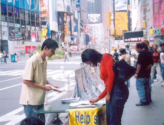 一次碰到四个穿着新潮的年轻学生,向他们派发真象资料时,他们拒绝了。可我并未放弃,当看到有一个女孩子还在频频回头向展板上看时,就走过去聊了起来。得知他们是来留学的南韩学生,今天上街游玩。她用并不流利的英文问我,这儿到底发生了什么?我有意放慢语速,告诉她法轮大法在南韩,乃至全世界广受欢迎,然而法轮功学员们却正在中国受到摧残的事实,现在这里模拟的只是冰山一角。女孩眼含泪水听着,最后问道,我能做些什么?我告诉她有几种方法可以帮助制止迫害后,她表示一定要去告诉朋友们事实真象。问清了在哪里填写征签表,她招呼另外几个同学,一起签了名。