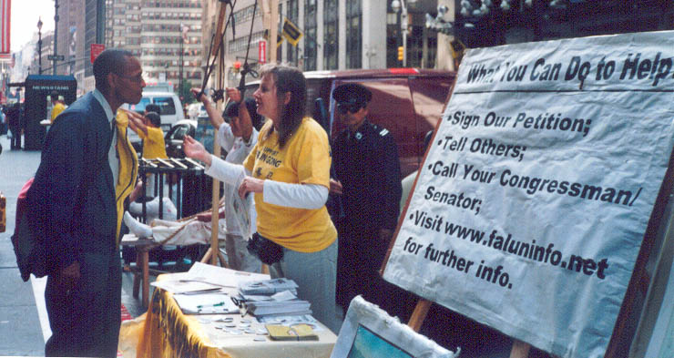 一次我们在第七大道38街上举行反酷刑展,正在布置道具与展板时,忽然听到一阵哇哇的叫声,开始以为谁在捣乱,跑过去一看,原来是位聋哑人,眼睛含着泪水,对着展板上被迫害的法轮功学员图片神情激动的挥舞双臂,嘴里还在不停的呜哇说着什么。估计他是震惊于这些迫害事实,同修们给他拿来了征签板,他签下了自己的名字,手里比划了一些什么,就走了。过了近一小时,他又来了,是与两位朋友一起来的。他领着他的朋友到了资料桌前,指着征签板让那女孩签名,然后又把她领到展板前让她看,似乎还在讲解着。等他们三人走后,大家都很感慨的说,他有一颗良善的心呀。