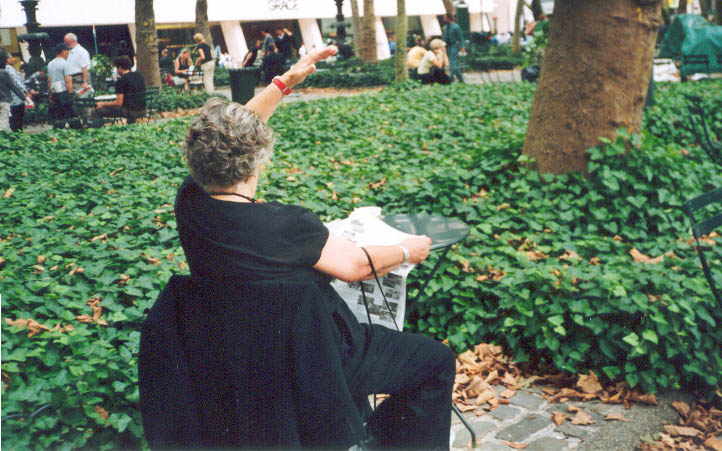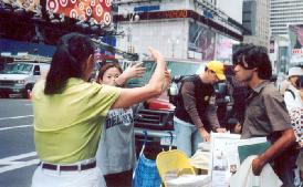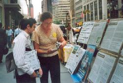 澳洲大法弟子与其它地区弟子们配合,以多种形式向人们讲述着正在中国发生的迫害真象。与纽约的反常酷热相反,曼哈顿街头匆匆走过的人们,大多数都是一脸冰霜,神情冷漠。起初感觉在纽约讲真象真难啊。我曾经见到一个同修在回答常人的问题时,叹了口气,拿起一份真象资料,用手一行行指给那人看。当时我想这位同修也许英文不好,就接过去讲了起来。后来看到这位同修讲真象时,英文相当流利,就明白了当时他是太累,连张嘴的力气都没有了。也许是为了印证我这个猜测,过了两天,资料桌上多了个当地同修给拿来的能放真象录音的扩音器。