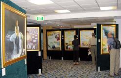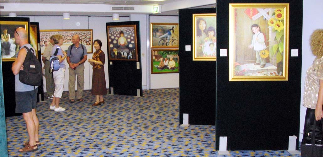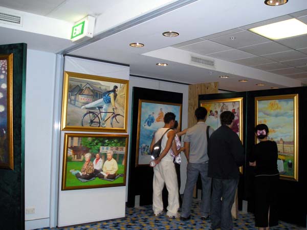 在展厅的入口处,是名为《横幅》的油画。画中的母亲聚精会神的缝制着横幅,可爱的宝宝在一旁静静的听法,整个场面是那么的安宁祥和、亲切朴实,也使来宾们放慢了匆匆的脚步。展厅虽然不大,但布置得错落有致又不失庄严。美展分为五部份。分别是“天上人间 佛光普照”、“同化大法 返本归真”、“生命见证 正信永存”、“传播真象 呼唤正义”、“善恶有报 正义审判”。
