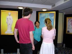 一些英文好的法轮功学员主动承担起导览的责任,一位导览说:其实并不用我们多说些什么,他们看了画,就已经明白了很多,因为这些太真实了。