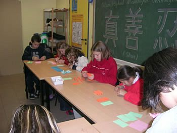 老师及一位协助她的家长记录下法轮功学员们所讲的,以便在稍后可以再告诉全班一遍。他们还请学员们示范制作莲花的步骤,以教给其他小孩。