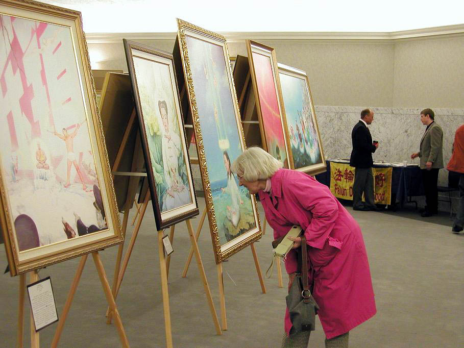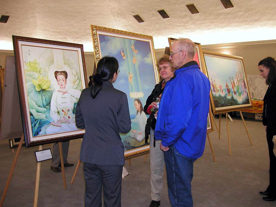 一位州参议员在法轮功学员的陪同下来到画展现场参观。她对修炼提了很多问题。在观看揭露迫害的画面时,她眼中含泪,说,这些画面让她难过的看不下去。在“永生”画作前,她说,“被迫害致死的法轮功学员很多都很年轻啊。”